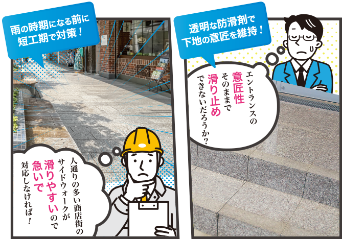 トップコートSTPは、透明のスリップ防止塗料なので、高級石材等の美観・質感を損なわず、防滑性能を向上させ、思わぬ転倒事故を減少させます。